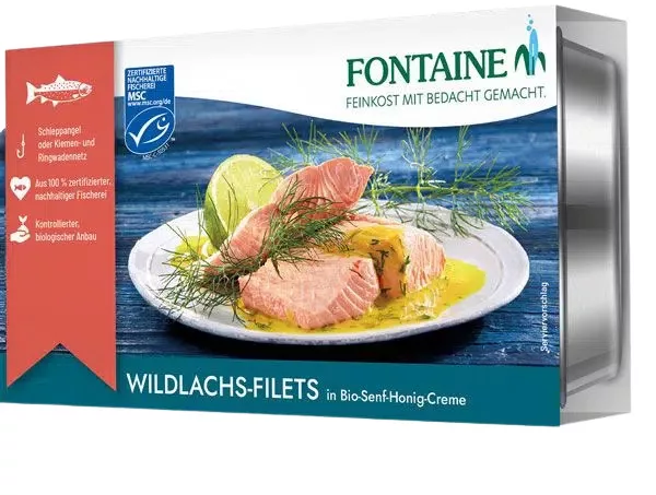A Fontaine vadlazac az alaszkai öbölből származik, fenntartható halászatból, amely megőrzi a halállományokat és a tengeri élőhelyet a jövő számára. A kifogást követően a halat felelősségteljesen dolgozzák fel és a legjobb bioösszetevőkkel ízesítik.